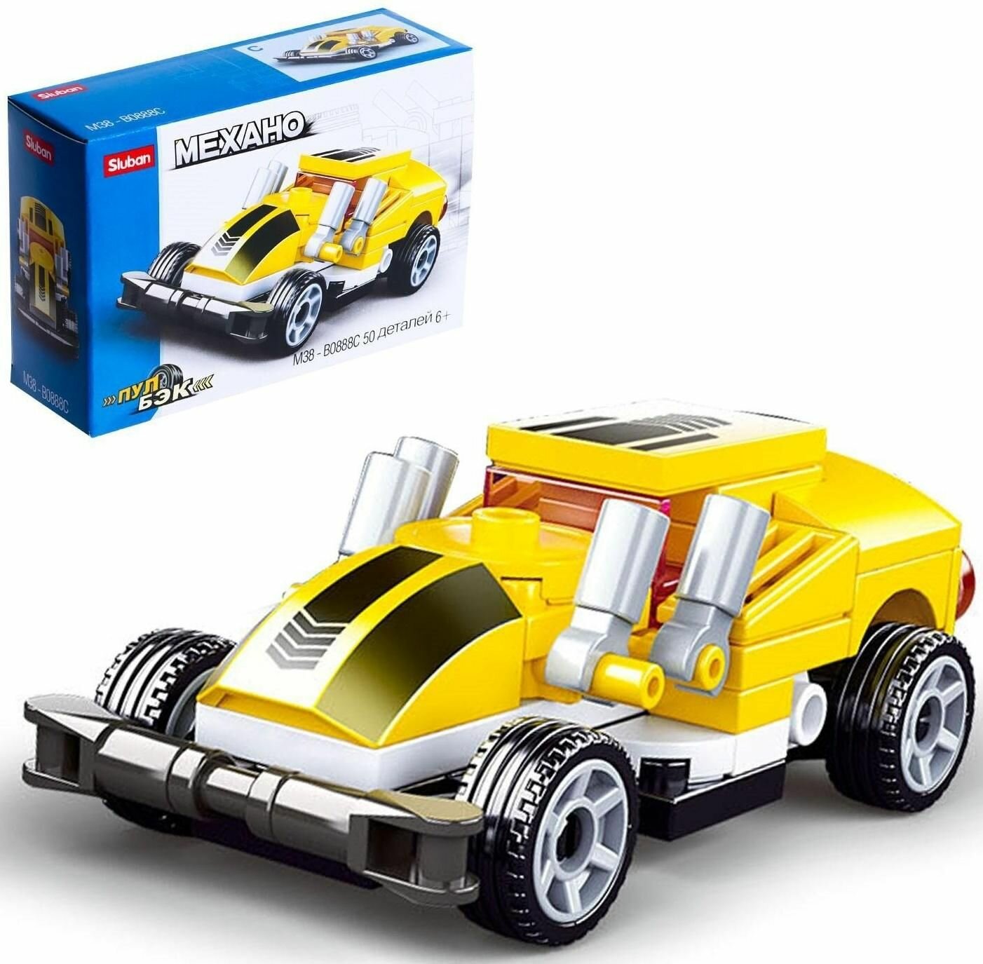 Конструктор Sluban серия "Механо", Гоночная машина, инерционная, желтая, 50 деталей (M38-B0888C)