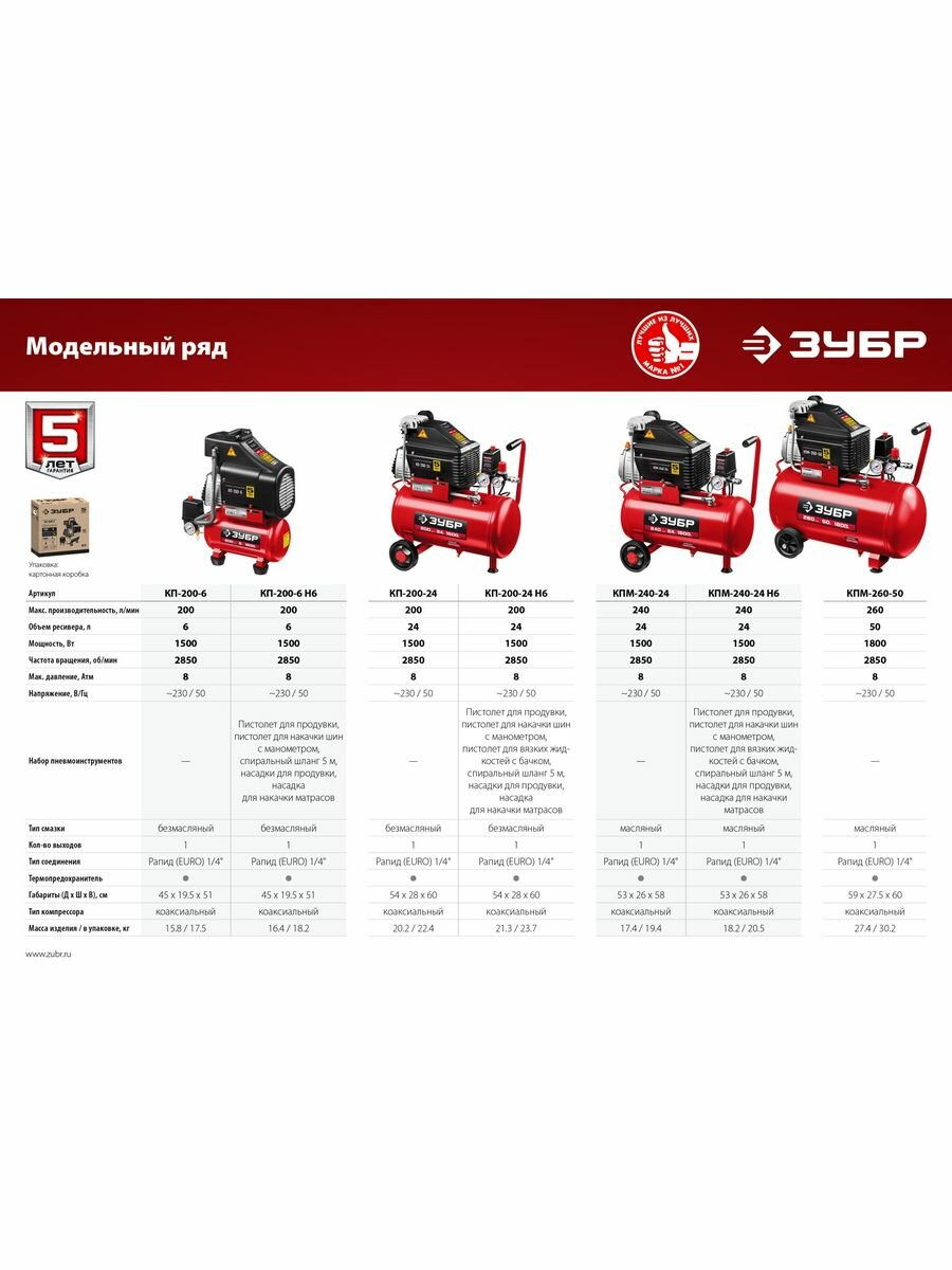 Компрессор масляный Зубр КПМ-240-24 Н6 с набором 24 л, 1,5 кВт