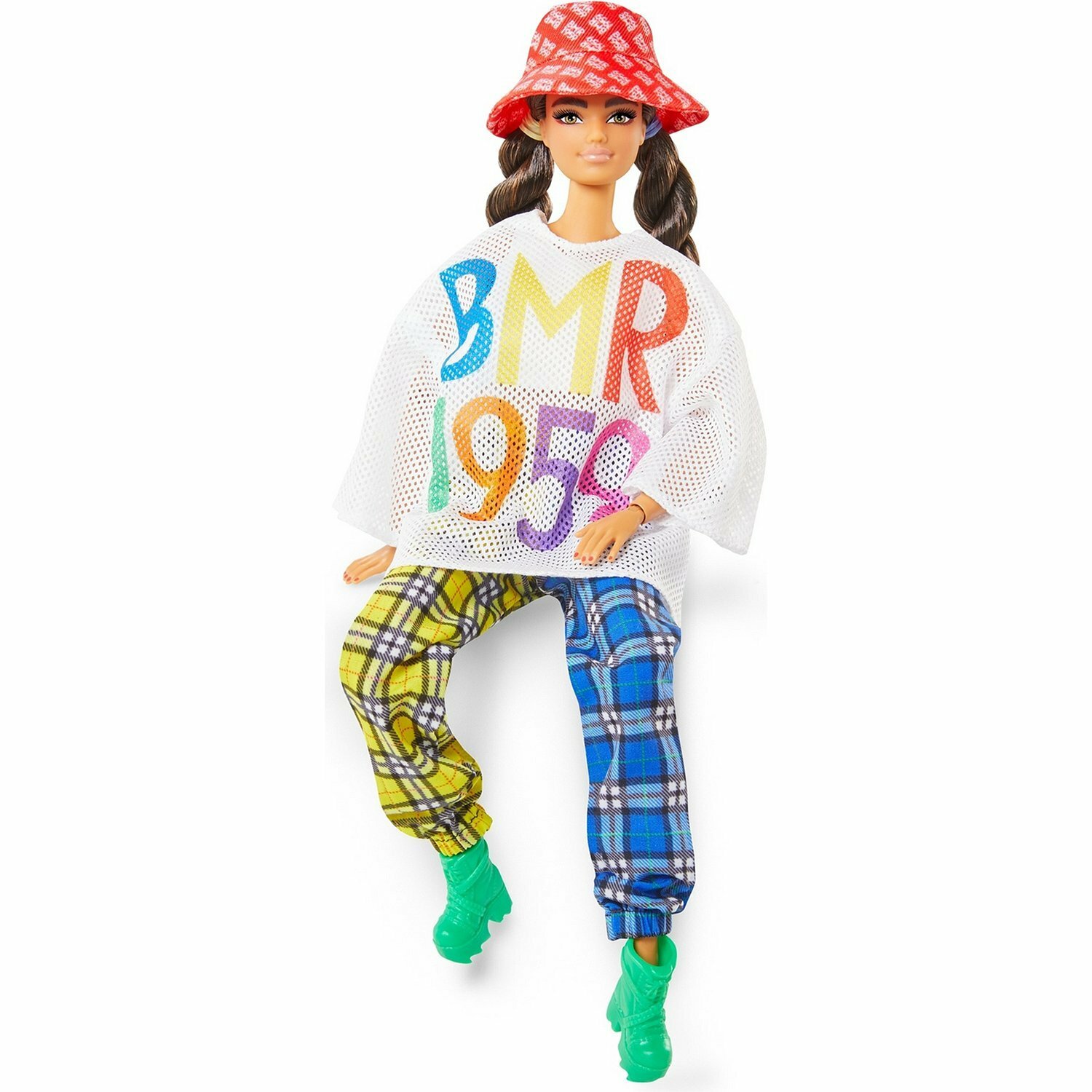 кукла Барби одета в клетчатые брюки и топ в сеточку с ярким логотипом;
