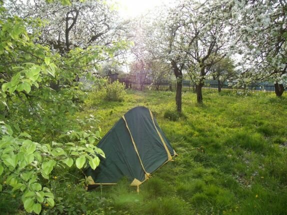 | Минусы: | Очень тесная. Да, это конечно однушка, "велосипедка", но палатка совсем без тамбура, это неудобно. Если вы плечистый человек - будет тесно, если у вас крупный рюкзак - спать с ним придется в обнимку. |