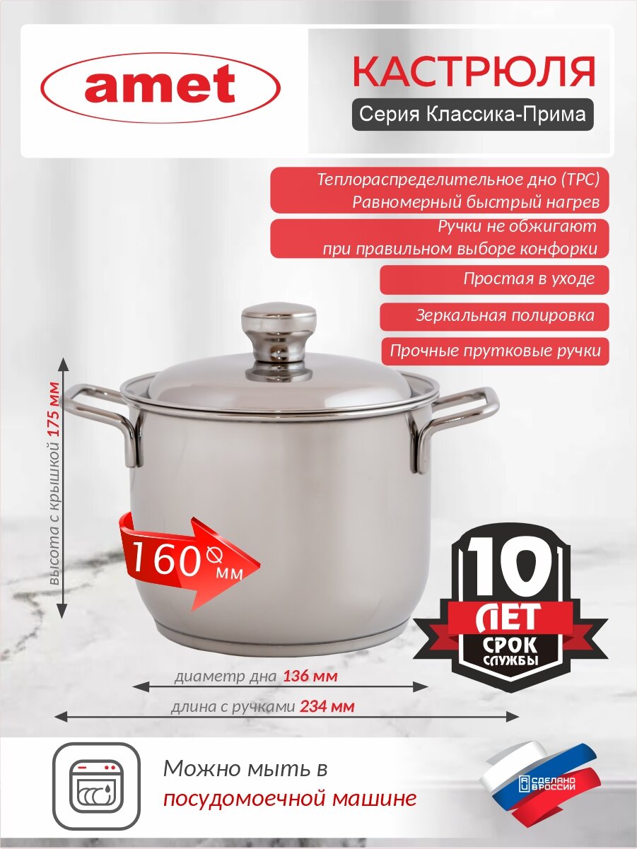 Кастрюля Амет Классика-Прима, 2.25 л, диаметр 16 см