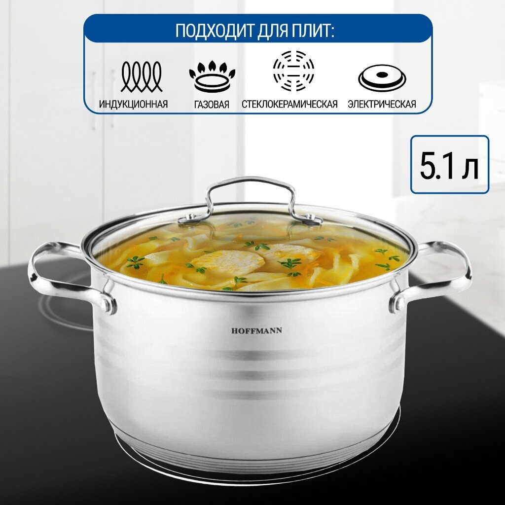 Кастрюля нерж, 5.1 л, с крыш, крыш стекло, Hoffmann, НМ 51122, индукц
