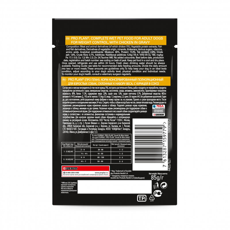 Влажный корм Pro Plan для взрослых собак мелких и карликовых пород, склонных к набору веса, с курицей в соусе, Пауч, 85 г х 52 шт