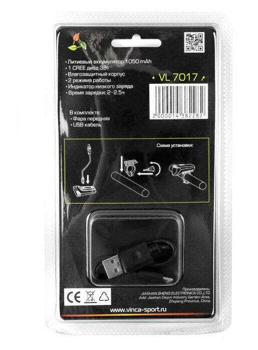 Фара передняя Vinca Sport для велосипеда и электросамоката с USB-зарядкой, черный