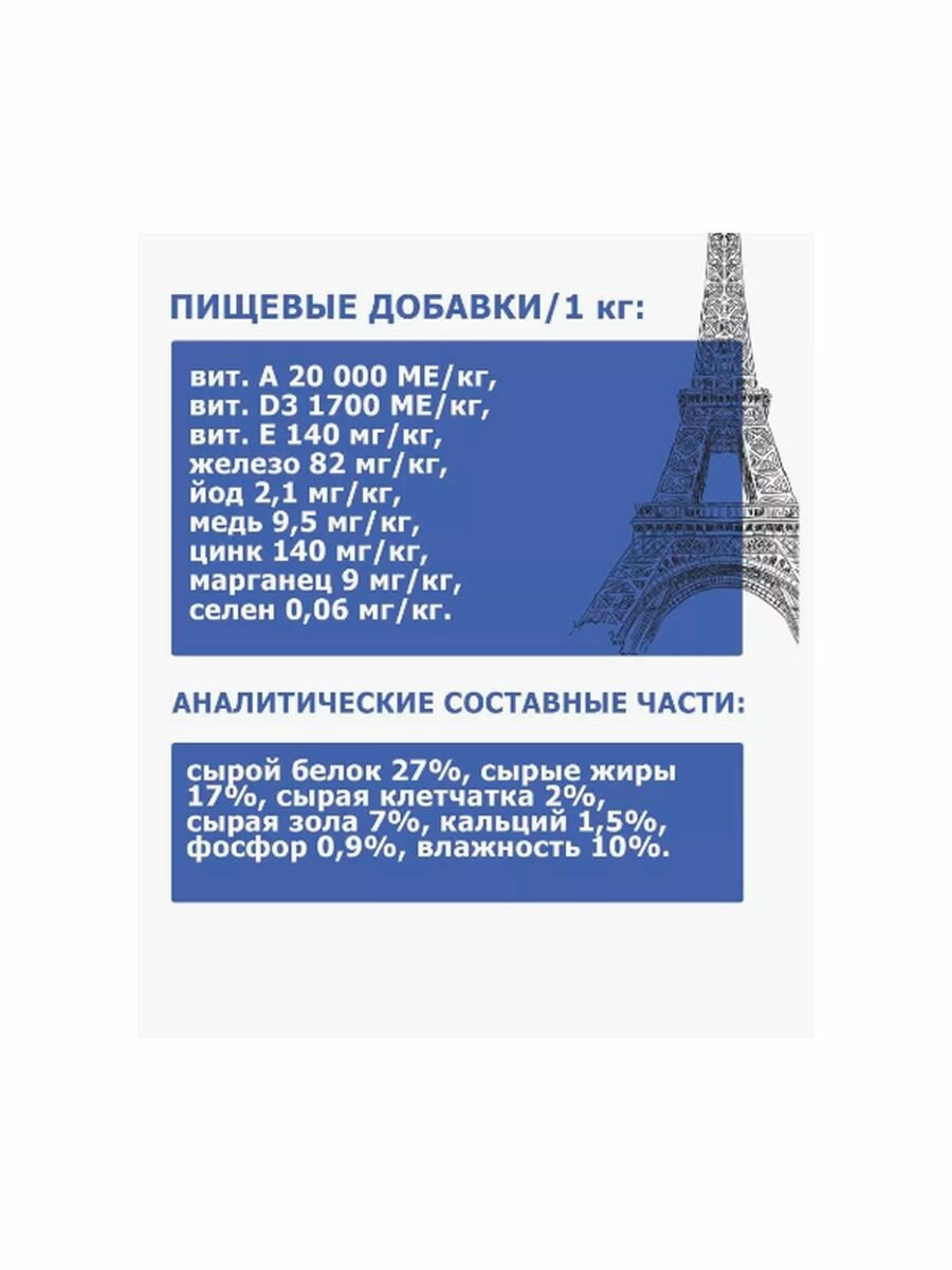 | Минеральные вещества | кальций 1,5%, фосфор 0,9%; железо (моногидрат сульфата железа) 76 мг / кг, медь (пентагидрат сульфата меди) 9 мг / кг, марганец (сульфат марганца) 9 мг / кг, цинк (сульфат цинка) 120 мг / кг, селен (селенометионин) 0,06 мг / кг, йод (безводный йодат кальция) 2 мг / кг |
