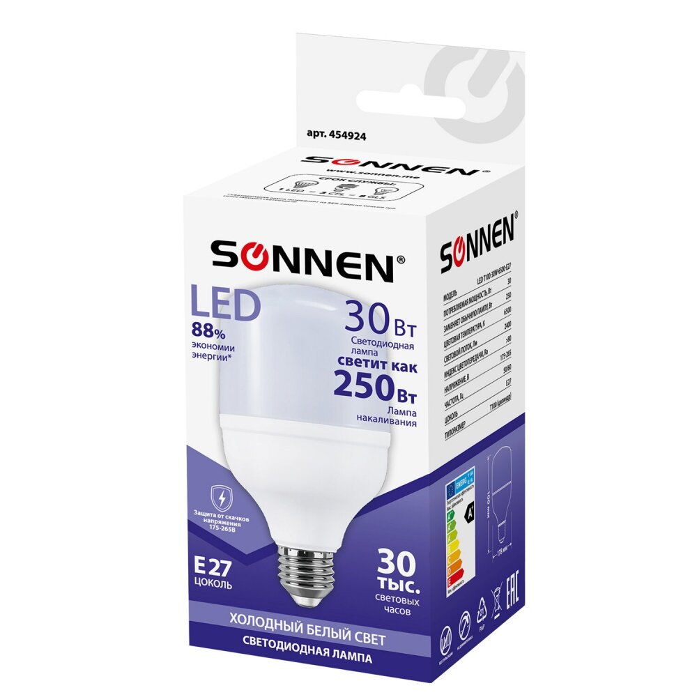 SONNEN Лампа светодиодная, 30 Вт, цоколь Е27, цилиндр, холодный белый, 30000 ч, 454924