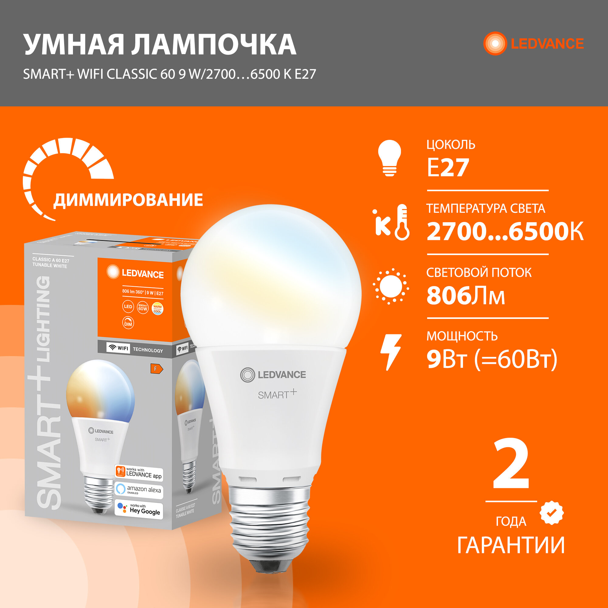 Умная лампа LEDVANCE WiFi Classic A Dimm 60 9 W/2700K...6500K E27 1055Lm 15000h d60*115