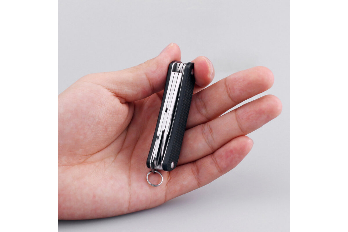 | Плюсы: | Качественные накладки G10, предположительно качественная сталь инструментов. Клинок, стропорез и ножницы отлично заточены. Реально полезные для наключного брелка инструменты: плейновый нож, ножницы, открывалка для бутылок, отвёртка и стропорез, он же открыватель блистеров. Не смотря на малую длину клинка, учитывая толщину в обухе, спуски и геометрию РК - вполне годный инструмент, а не игрушка. |