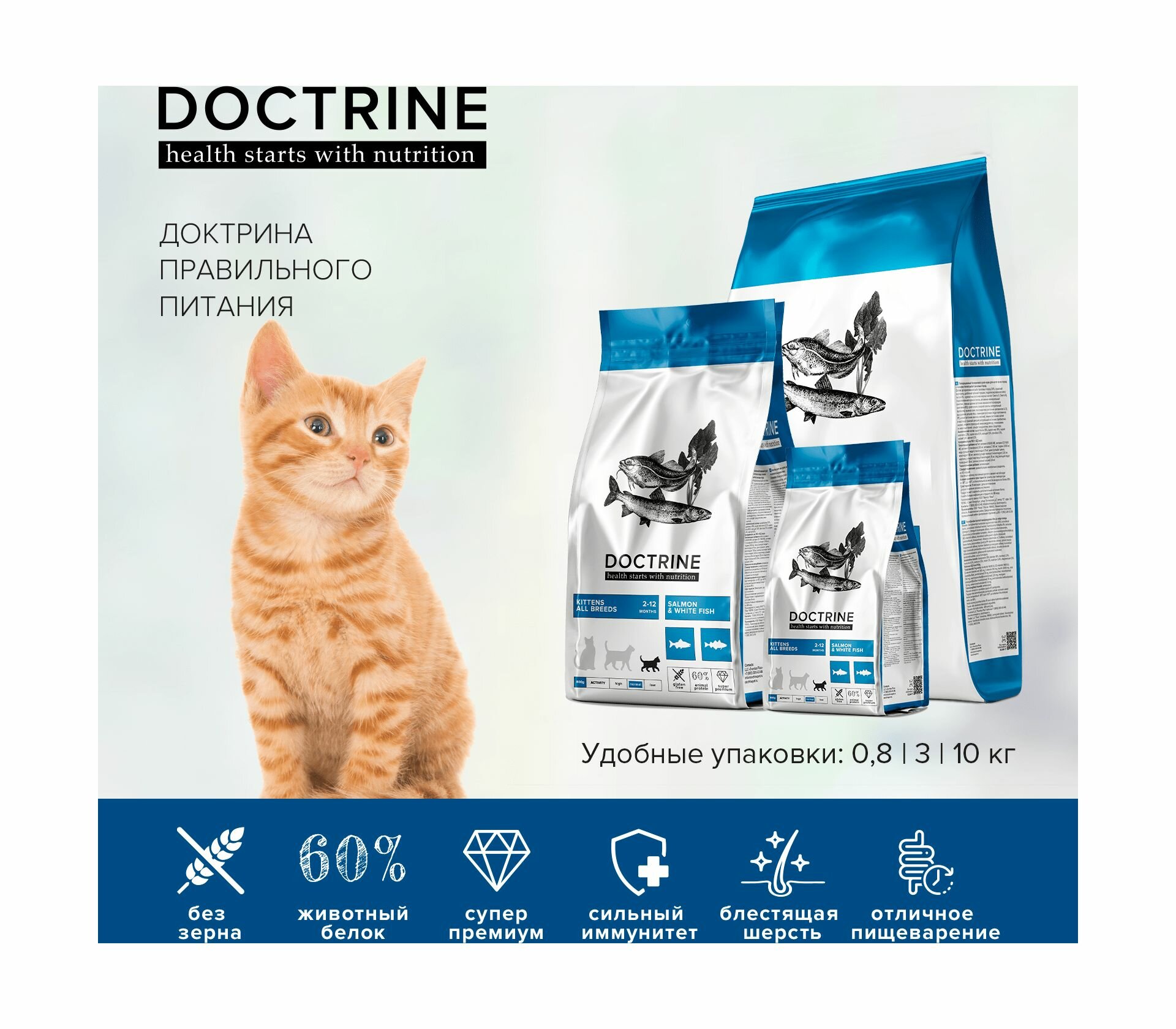 Сухой корм для котят Беззерновой DOCTRINE с лососем и белой рыбой 10кг / доктрин, доктрина