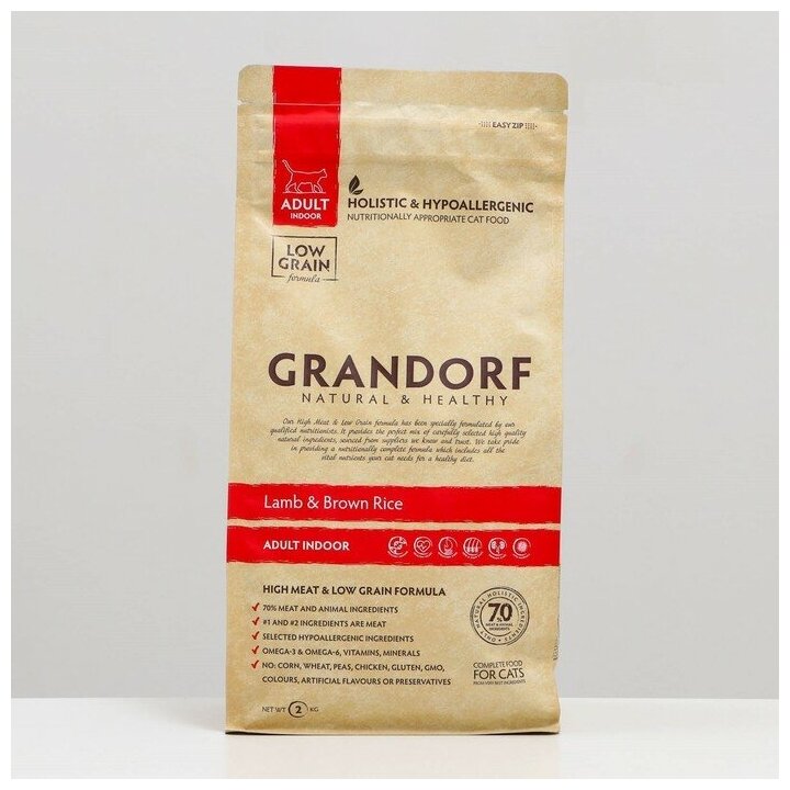 Корм для кошек GRANDORF Ягнёнок с рисом Indoor 2кг. Для взрослых кошек от 1 года с нормальной активностью.