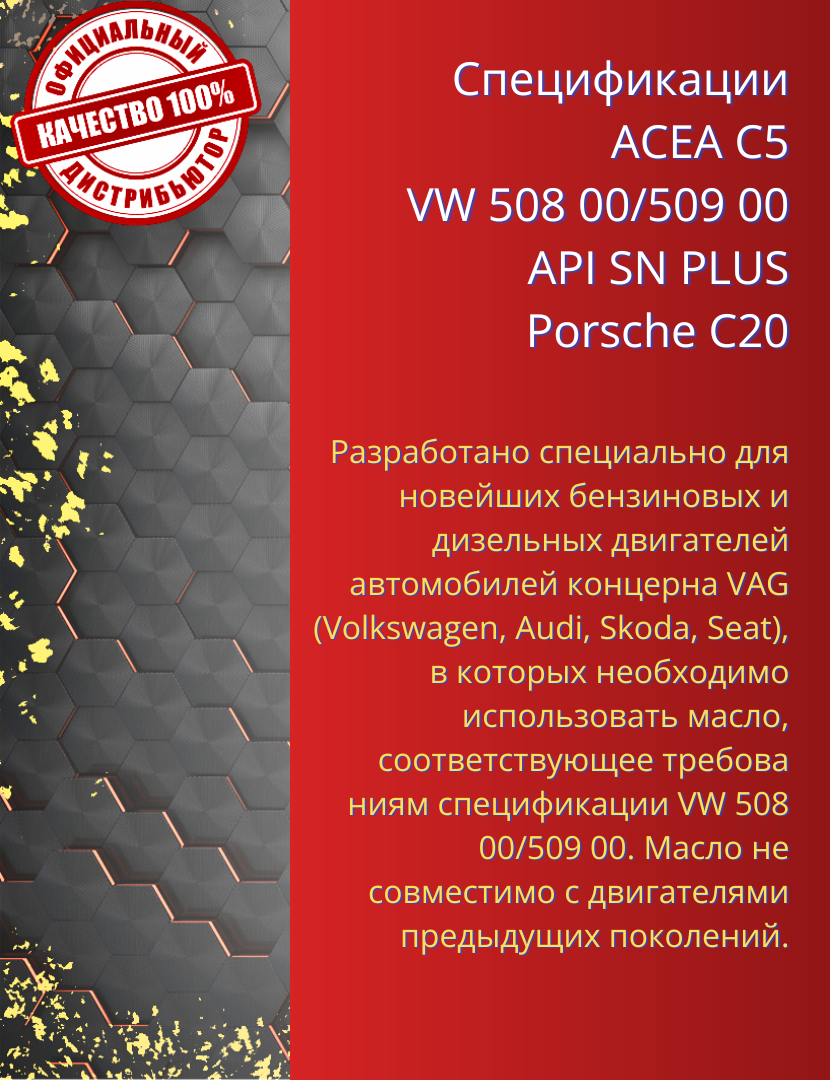 | Допуски OEM | VW 509.00 / VW 508.00 / Porsche C20 |