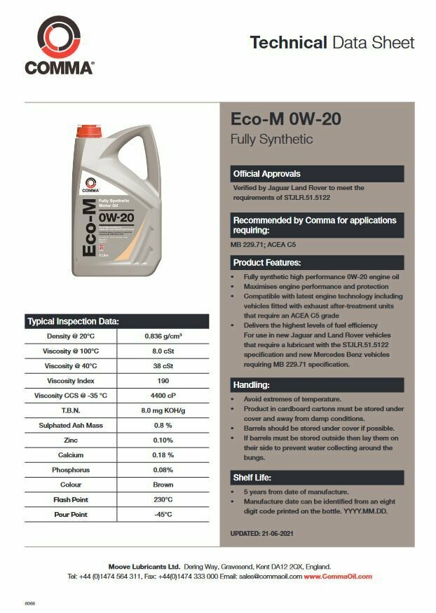 Comma 0W20 Eco-M (5L)_Масло Моторное! Acea C5б Mb 229.71, Jaguar Land Rover Stjlr.51.5122 COMMA арт. ECOM5L интересное: