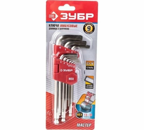 Набор ключей Зубр "Мастер" имбусовые длинные с шариком Cr-V HEX 1,5-10 мм 9 предметов, 27461-2_z02