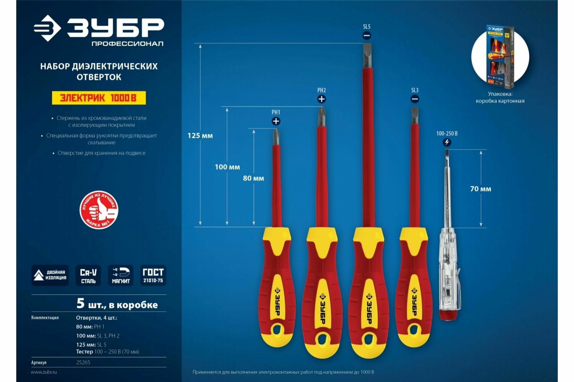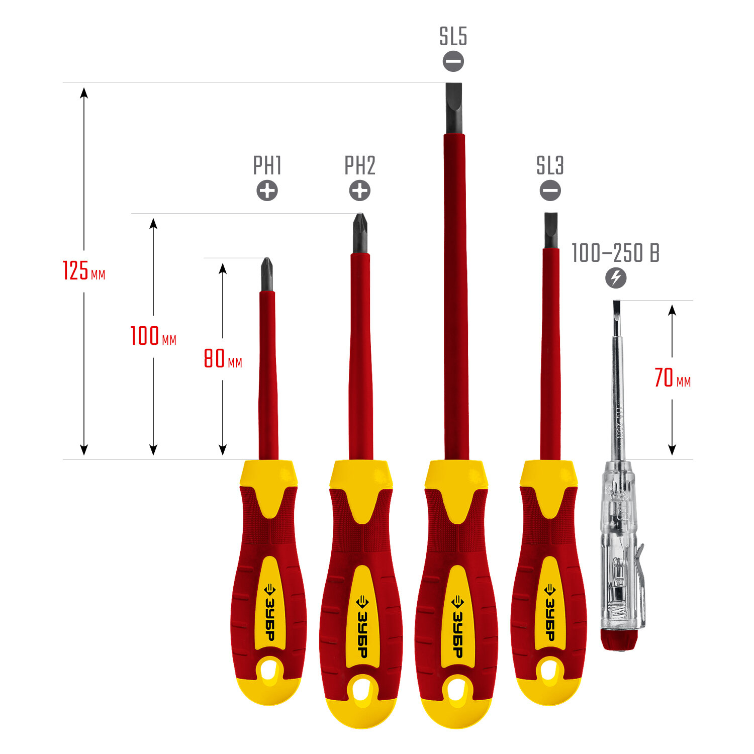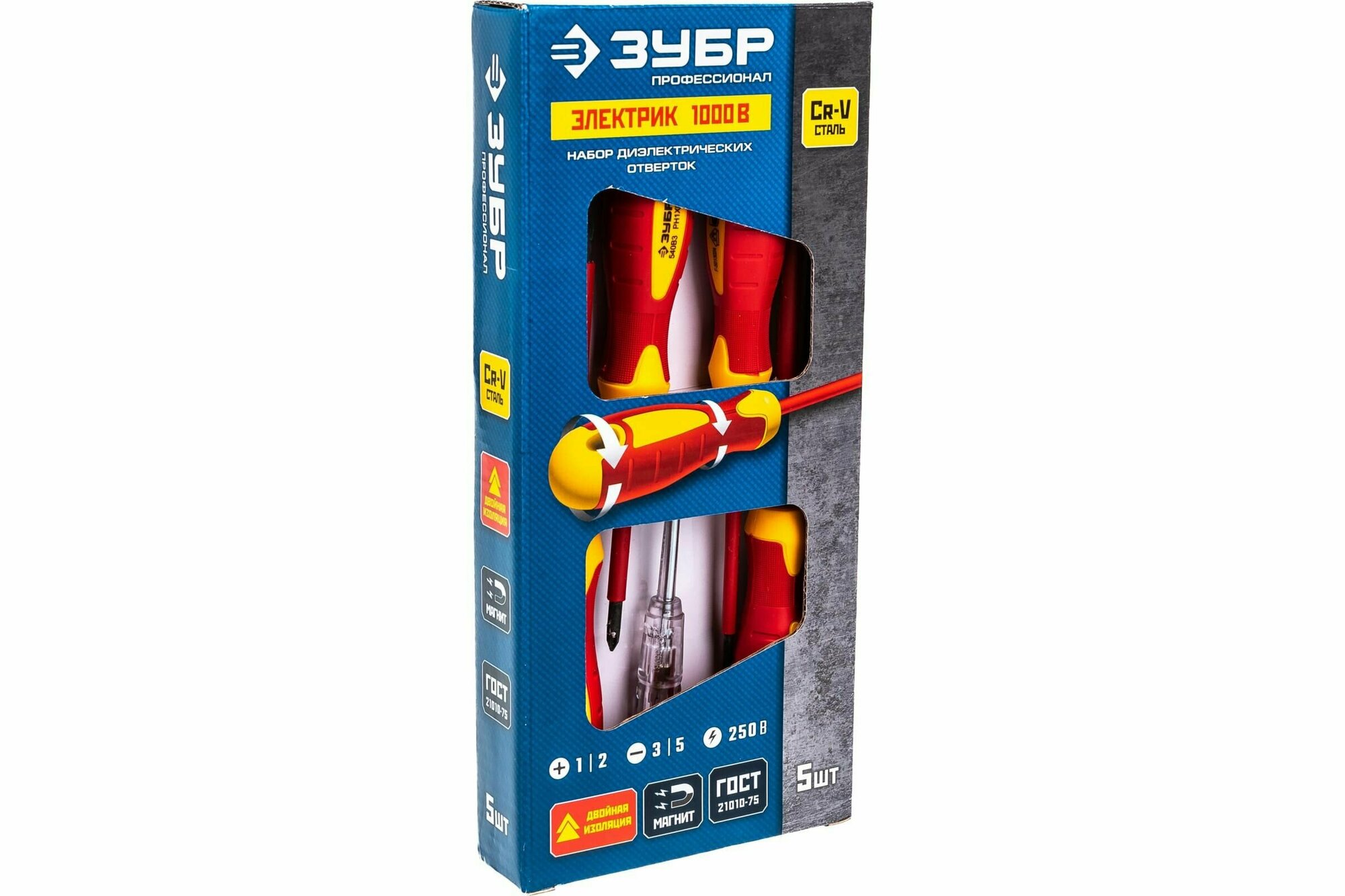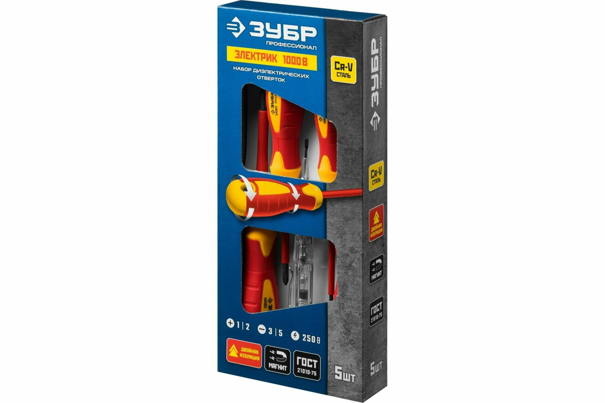 Набор диэлектрических отверток Зубр профессионал 1000 В, SL 3, 5 / PH 1, 2, тестер 100-250 В, в коробке, 5 предметов 25265