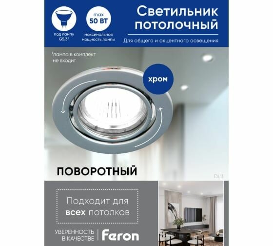 Светильник Feron Светильник потолочный встраиваемый, MR16 G5.3 хром, DL11, Feron, 15118, G5, 50 Вт, цвет арматуры: хром, цвет плафона: серебристый, 10 шт.