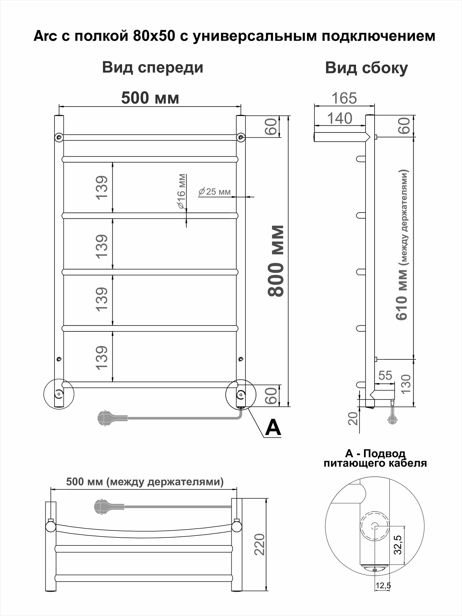 Полотенцесушитель электрический INDIGO Arc с полкой 80/50 скрытый монтаж, универсальное подключение