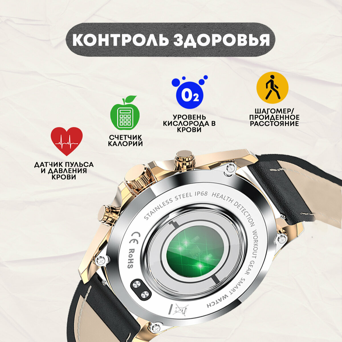 Смарт часы наручные мужские круглые KingWear LW09 умные смартчасы, фитнес браслет с пульсометром, для андроид и айфона, с кожаным ремешком