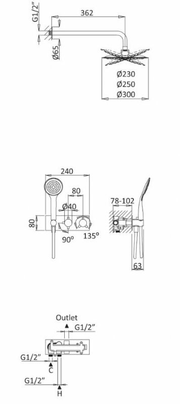 Душевая система с термостатическим смесителем с верхним и ручным душем CEZARES CZR-B-VDIM-T-01