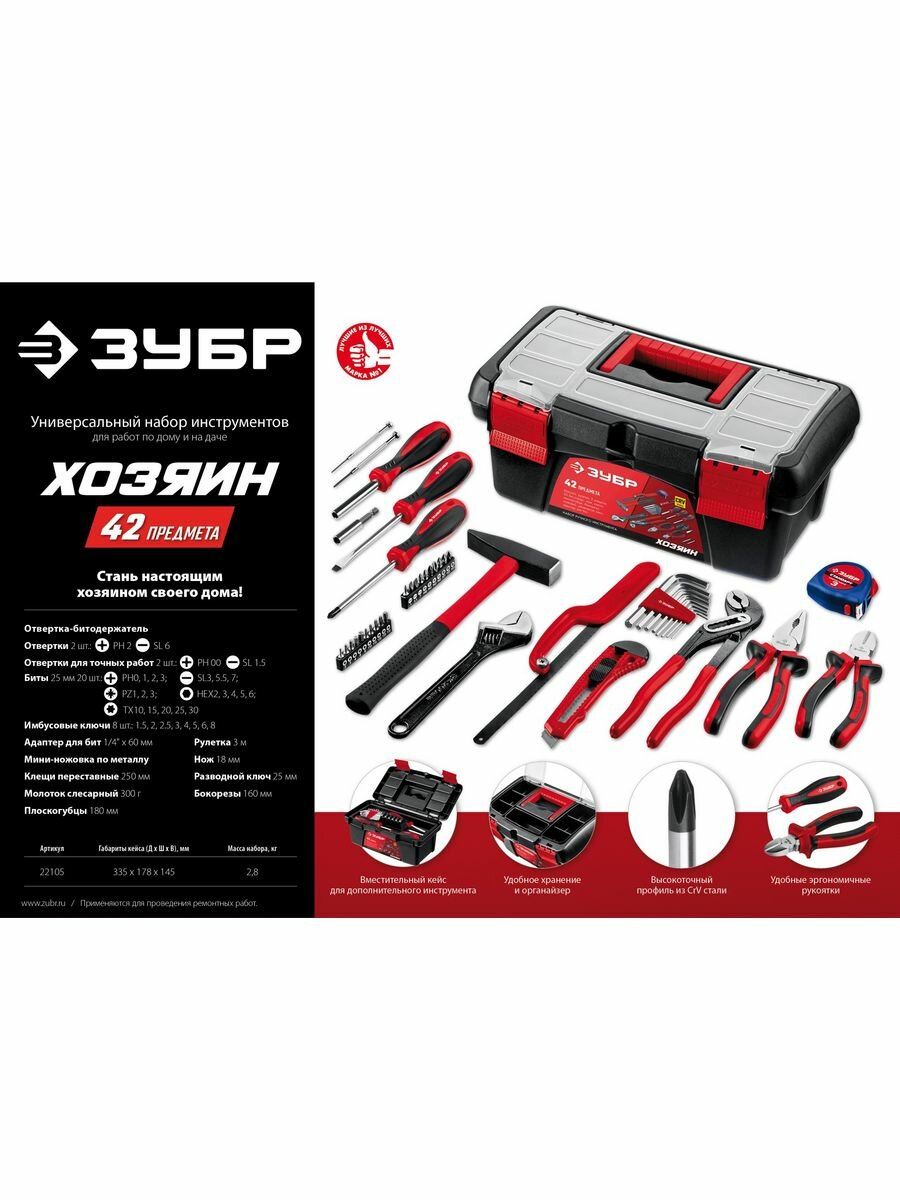 Набор инструмента Зубр 22105, Хозяин-42 для дома, 42 предмета Зубр 9623047 .