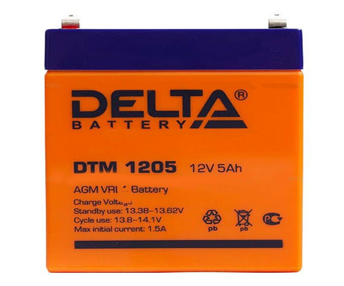 Батарея DELTA серия DTM, DTM 1205, напряжение 12В, емкость 5Ач (разряд 20 часов), макс. ток разряда (5 сек.) 75А, макс. ток заряда 1.5А, свинцово-кислотная типа AGM, клеммы F2, ДxШxВ 90х70х101мм., вес 1.8кг., срок службы 6 лет. Delta UPS DTM 1205 (12V /