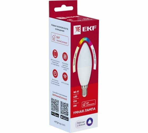 Умная светодиодная лампочка EKF Connect 5W RGB+W Е14 с Wi-Fi, Яндекс Алисой, Марусей, Салютом