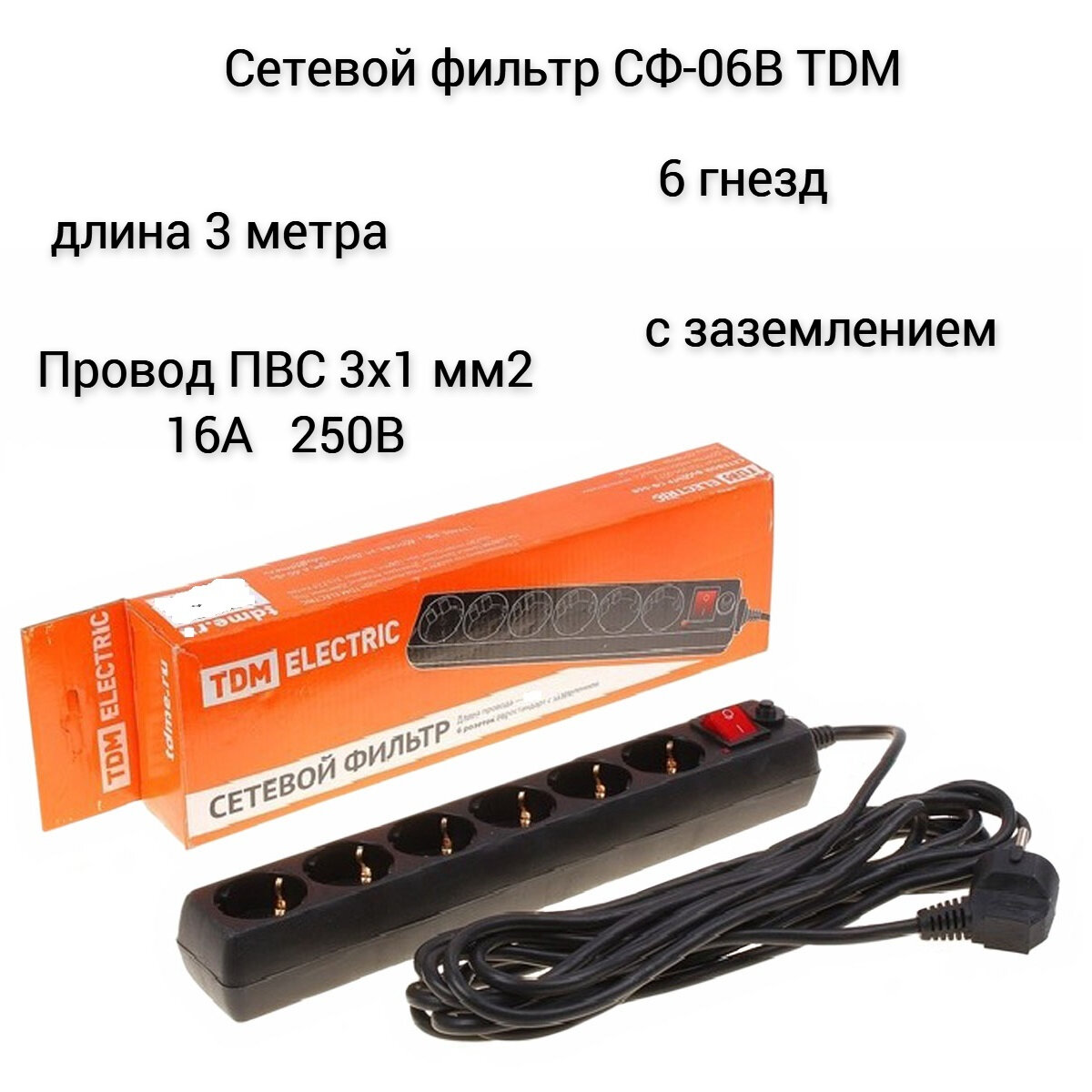 СохранитьСетевой фильтр СФ-06В выключатель, 6 гнезд, 3 метра, с заземлением, ПВС 3х1мм2 16А/250В черный TDM интересное: