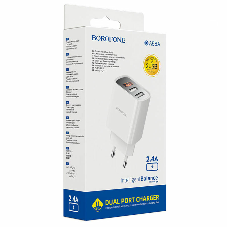 Сетевое зарядное устройство c двумя USB, Borofone, BA58A, с дисплеем, отображение тока и напряжения, 2,4A, белое