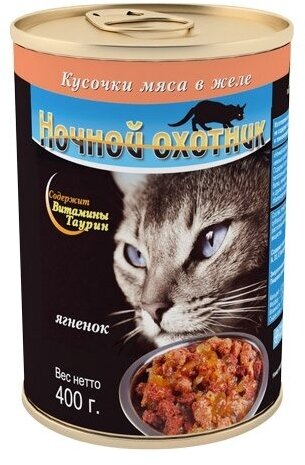 Ночной охотник влажный корм для взрослых кошек всех пород, ягненок, кусочки в желе 400 гр (10 шт)