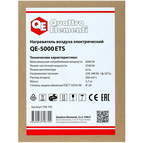 Купить Нагреватель воздуха электрический QUATTRO ELEMENTI QE-5000 ETS (5кВт, 260 м.куб/ч, 220 В, реж вент), шт