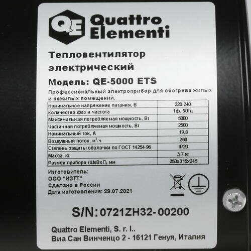 Тепловая пушка электрическая 5 кВт QUATTRO ELEMENTI QE-5000 ETS с ТЭН (5 кВт, 220 В, 260 м3) 2.5/5 кВт