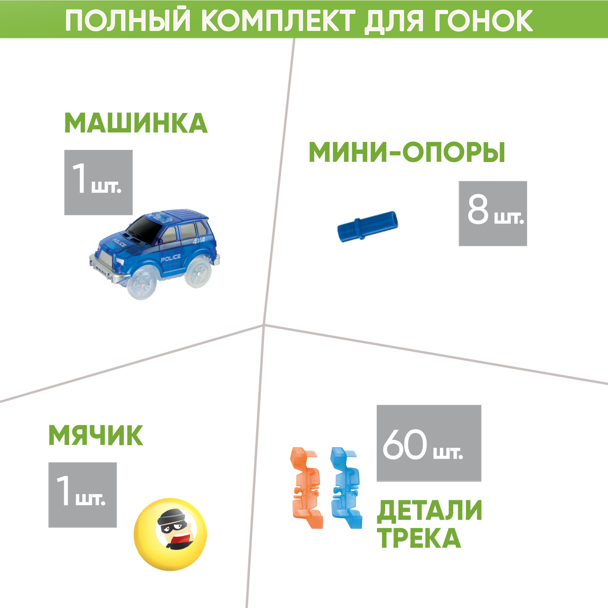 | Комплектация | 1 машинка,60 деталей трека, 1 мячик, 8 мини-опор |