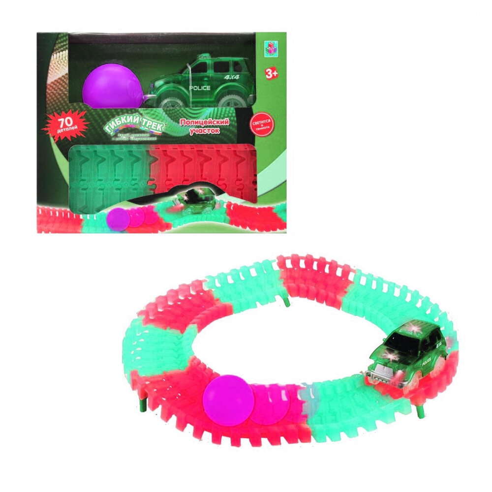 Гибкий трек 1TOY мини-набор "Полицейский участок" 70деталей (дорога светится в темноте + машинка со светом) интересное: