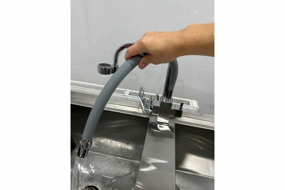 - Удобный гибкий водопроводный кран. Очень удобно применять для мытья большой по размерам раковины. Достаёт довольно далеко - Качество исполнения вроде не вызывает замечаний |