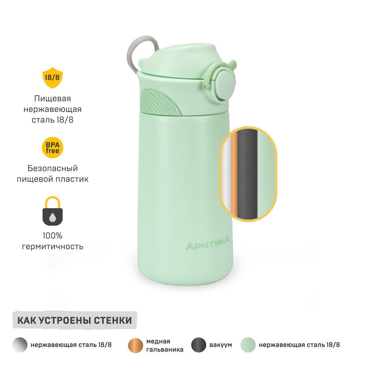 ARK-711-390-1 мятный Термос детский питьевой, бытовой, вакуумный (для напитков), тм Арктика, 390 мл