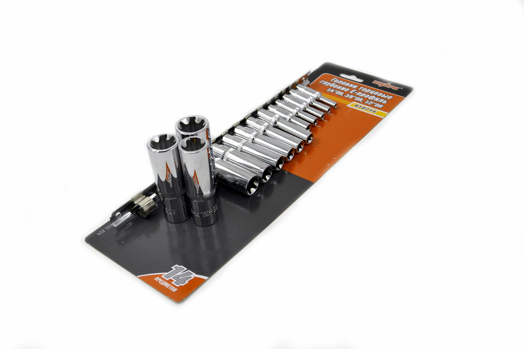 910714 Набор головок торцевых глубоких 1/4", 3/8", 1/2"DR на держателе, внешний TORX, E4-E24, 14 предметов