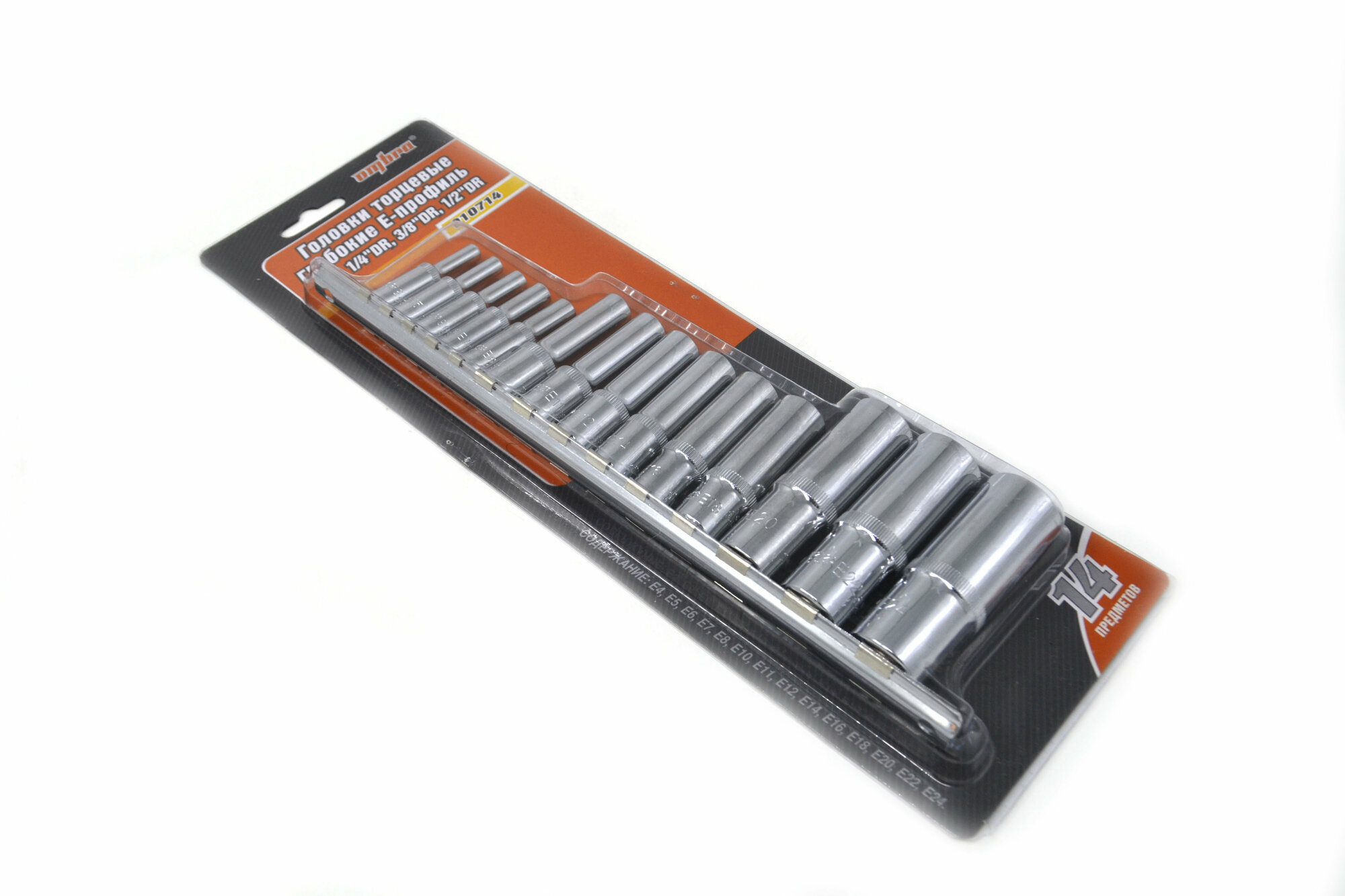 Набор глубоких торцевых головок 1/4, 3/8, 1/2 DR, внешний TORX, E4-E24, 14 предметов, Ombra 910714
