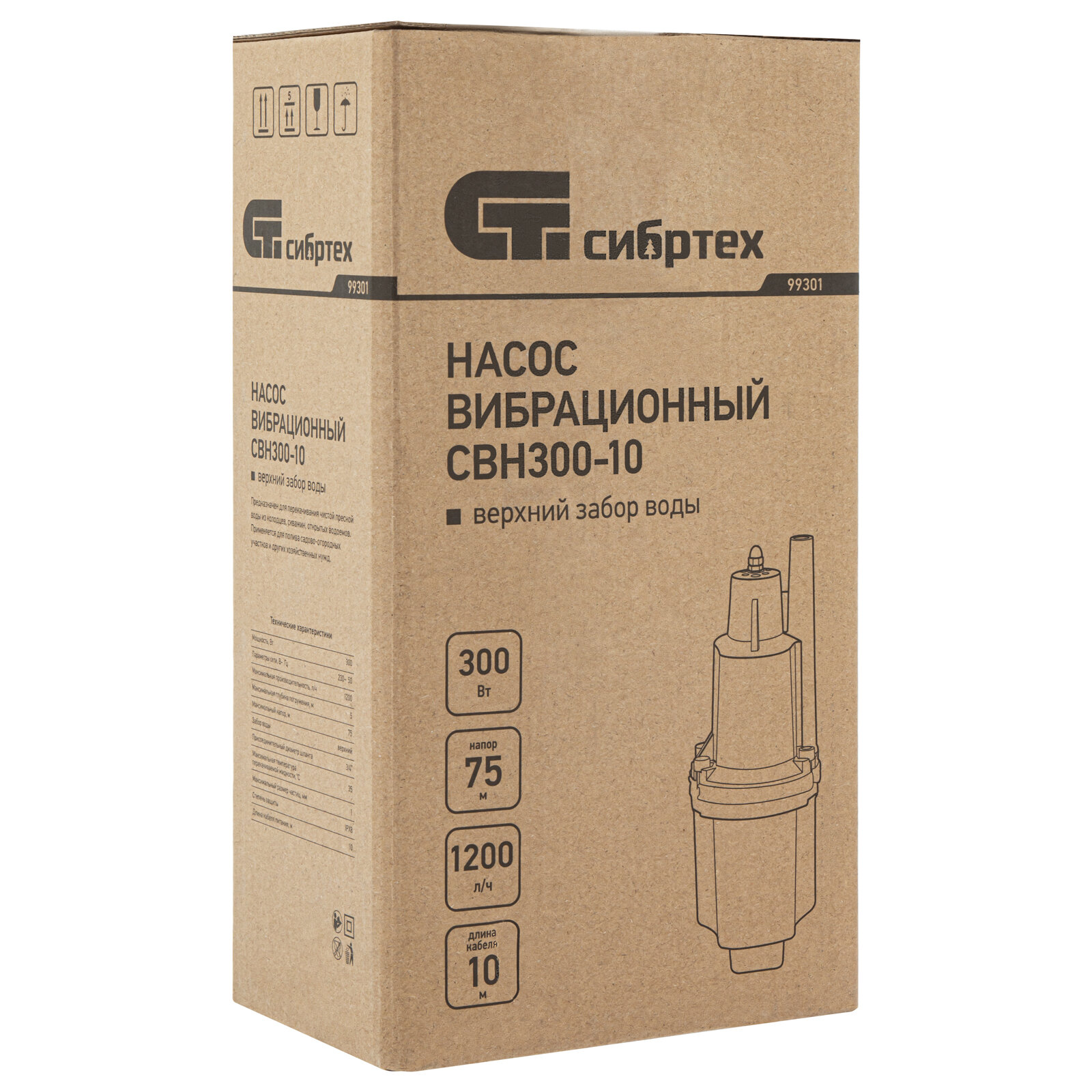 Вибрационный насос СВН300-10, верхний забор, 300 Вт, напор 75 м, 1200 л/ч, кабель 10 м Сибртех, 1200 л/ч 99301