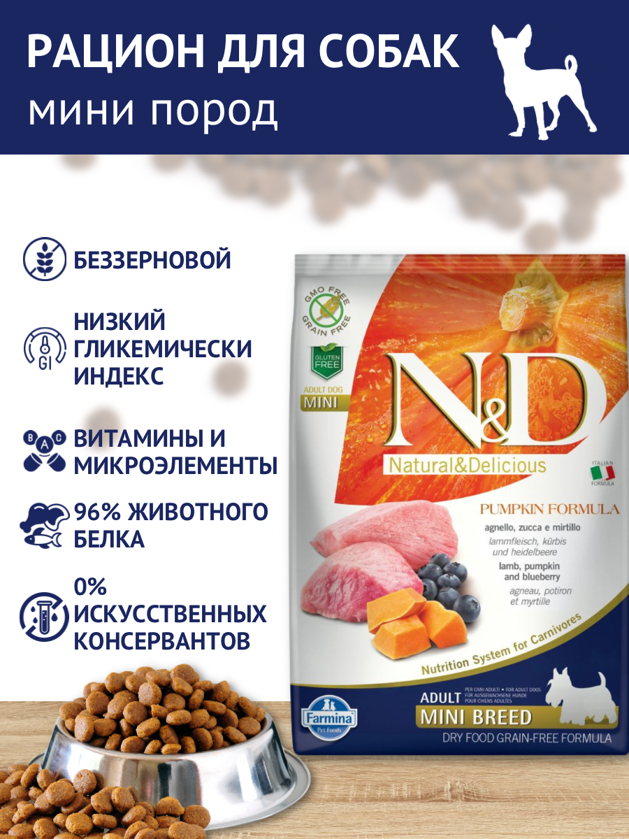 Корм для собак сухой Фармина N&D Pumpkin Mini Adult Беззерновой для мелких пород животных, гранулы с ягненком, черникой и тыквой 2.5кг /