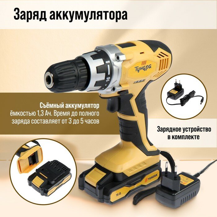 Шуруповерт TUNDRA, патрон БЗ до 10 мм, подсветка, Li-ion 1300 mAh 16V, 550 об/мин, 24 Н*м
