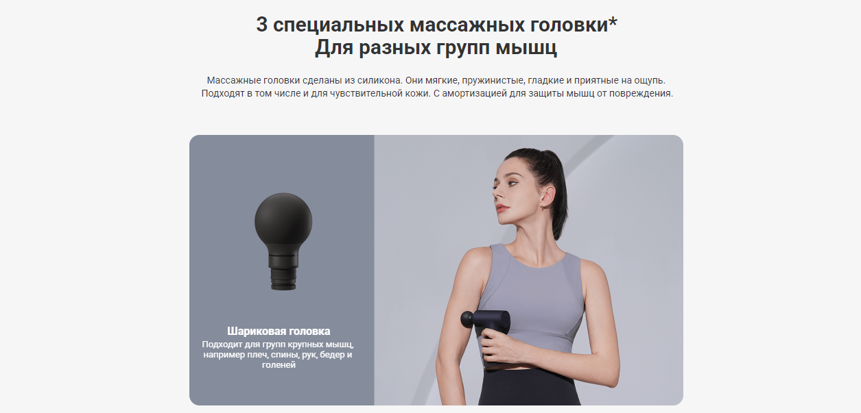 | Подробная комплектация | 3 специализированные массажные головки: шаровая, U-образная, плоская головка |