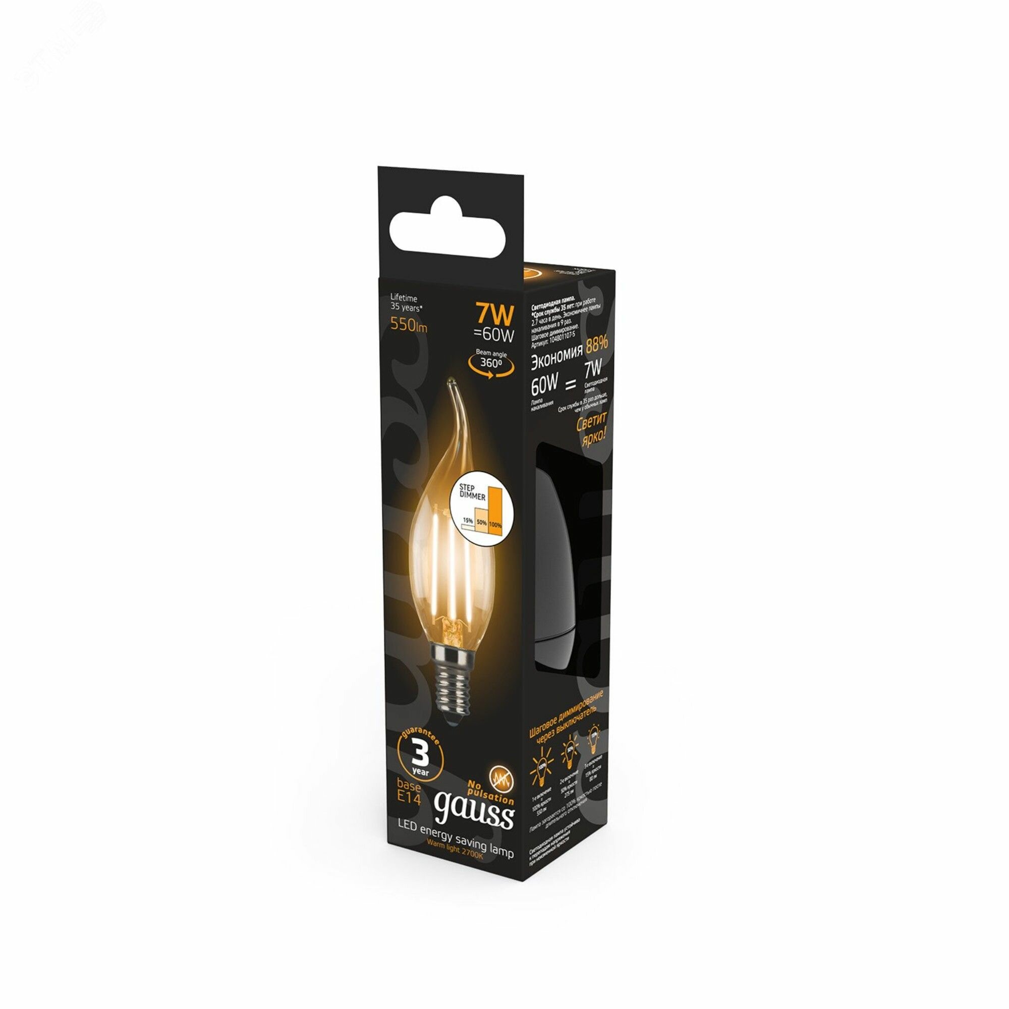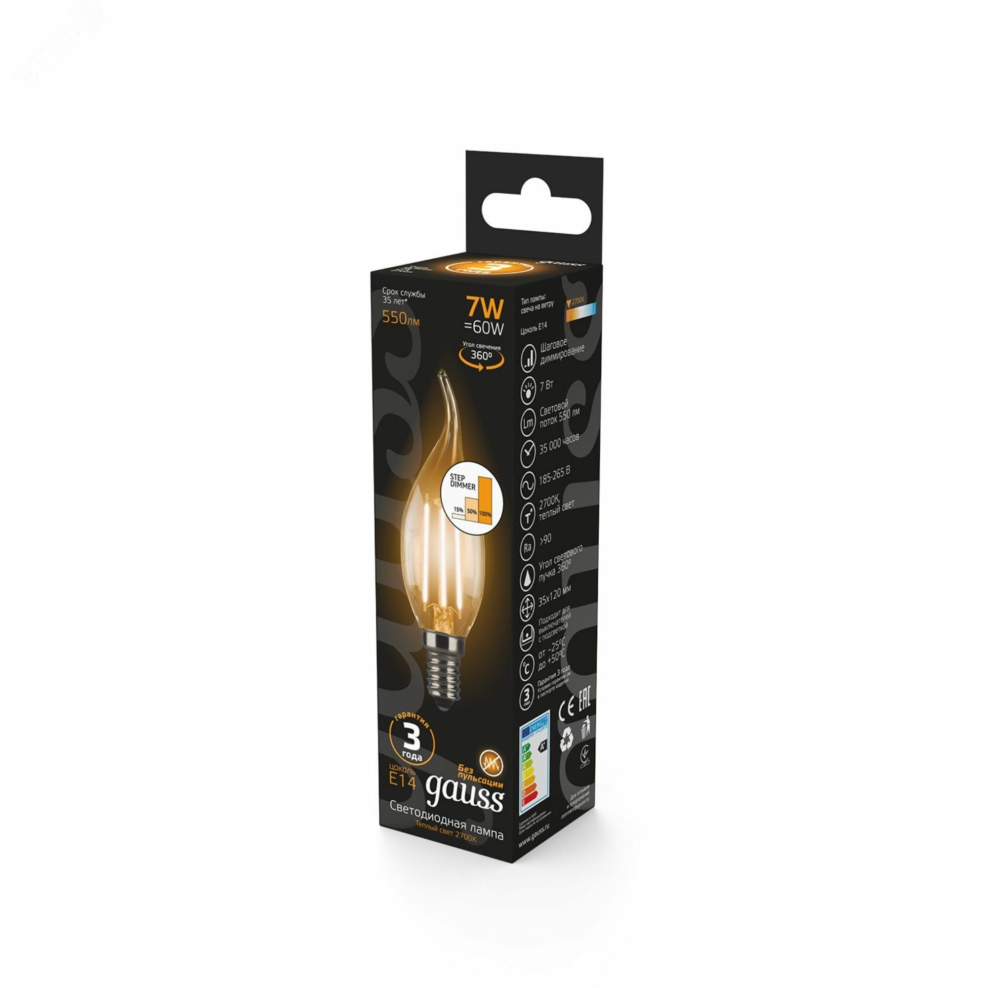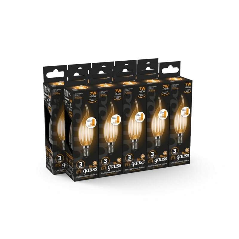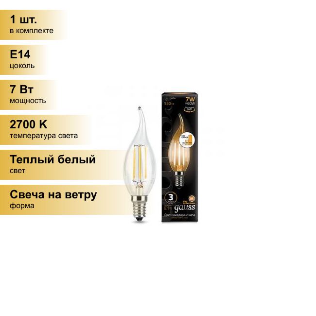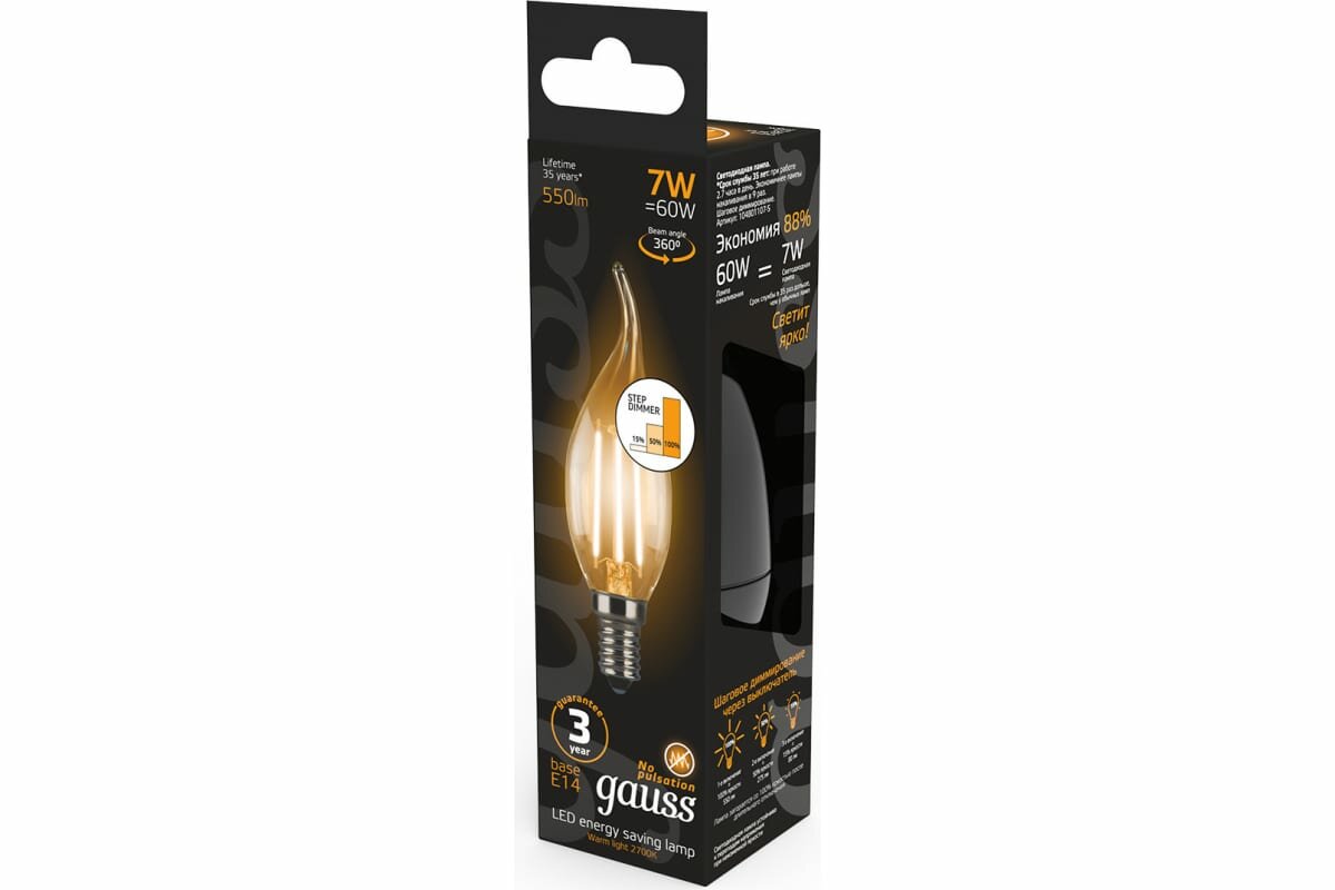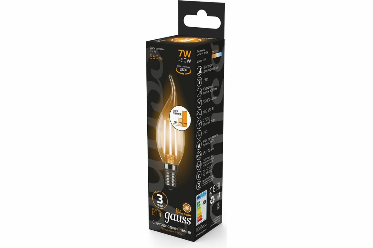 Gauss Лампа Filament Свеча на ветру 7W 550lm 2700К Е14 шаг. диммирование LED интересное: