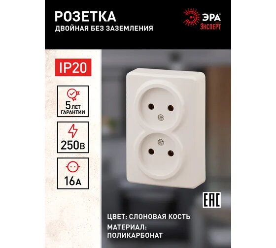 Розетка силовая штепсельная ЭРА 12-2107-02, 16А 250В IP20 слоновая кость, 2х2P без заземления, двухместная, Б0031239 / электрооборудование