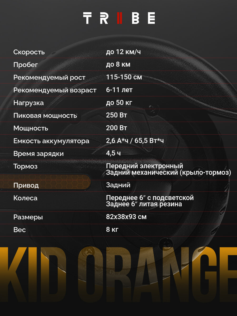 Купить Детский электросамокат Tribe Kid Orange (200 Вт, 6,5", 2600 мАч, 12 км/ч, 8 кг,с 6 лет)
