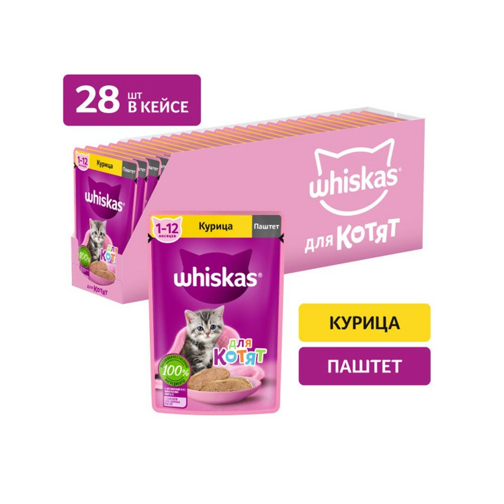 Влажный корм WHISKAS® для котят от 1 до 12 месяцев, паштет с курицей, 75г*24шт