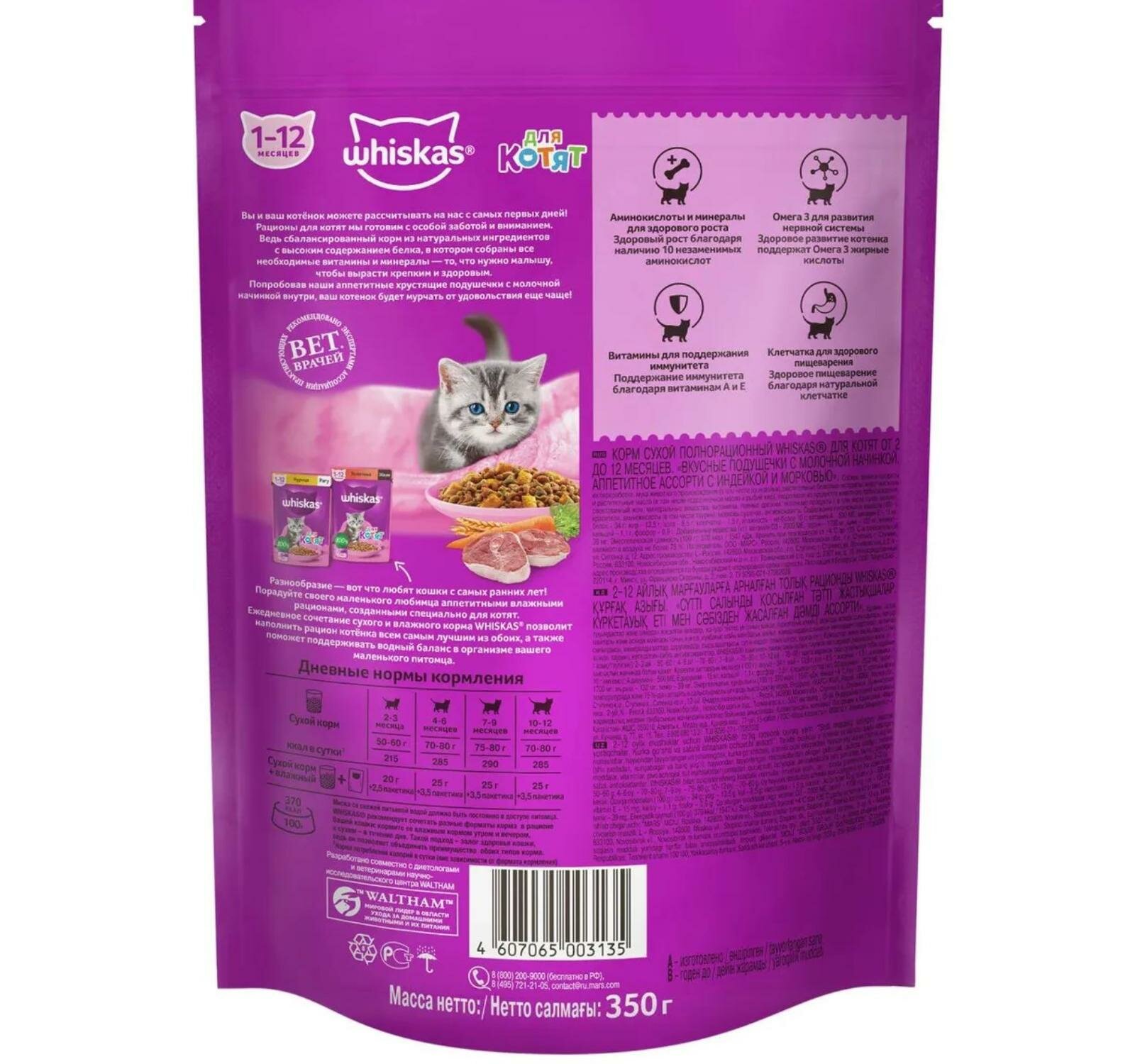 СохранитьСухой корм Whiskas для котят молочные подушечки индейка и морковь 350г интересное: