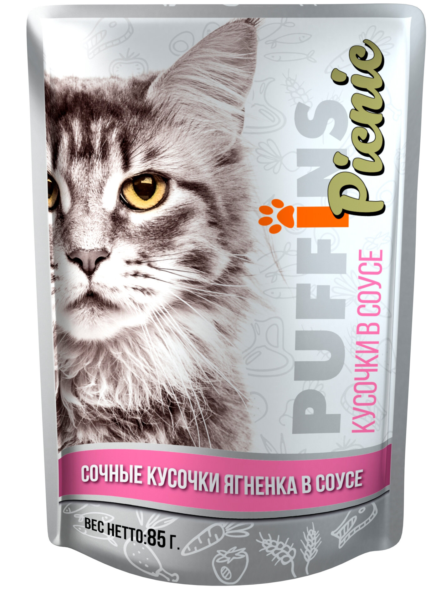 Влажный корм "Puffins" для кошек, сочные кусочки ягненка в соусе, 100 г