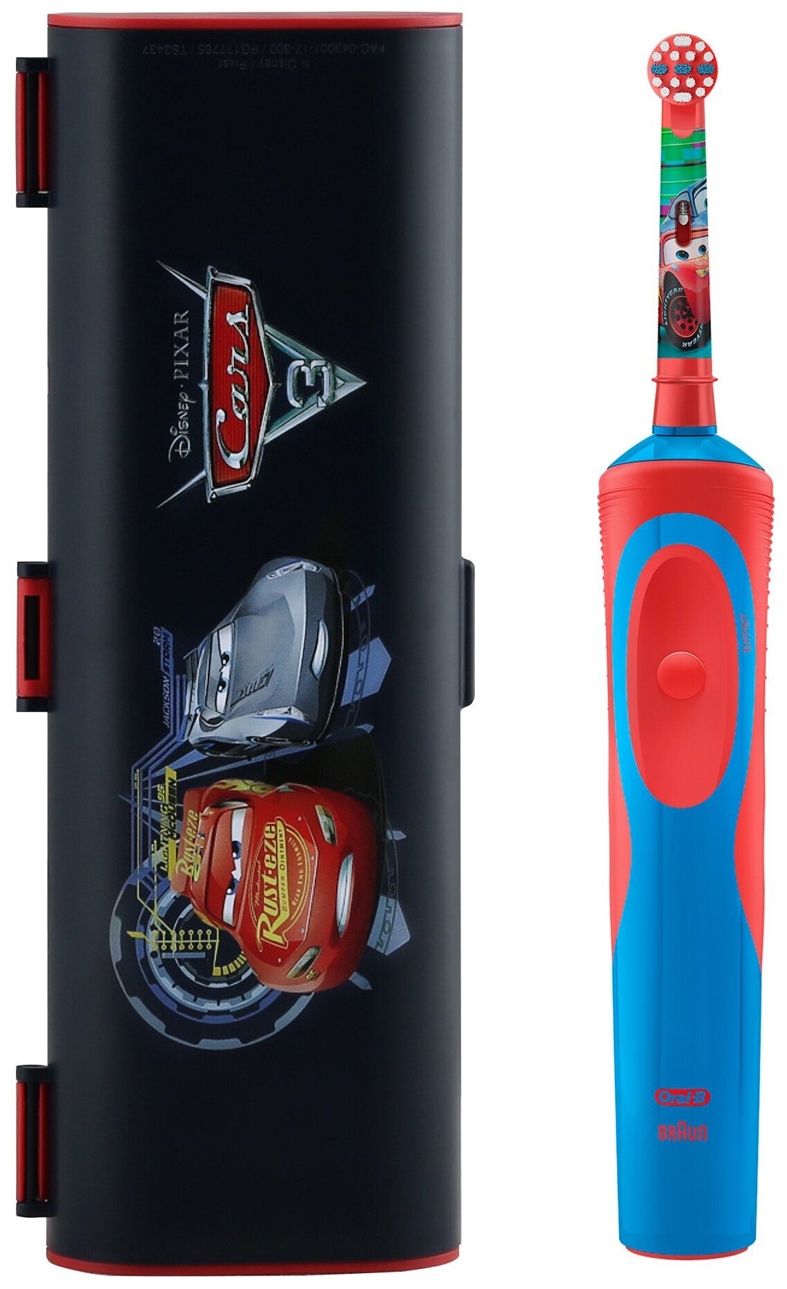 Детская электрическая зубная щетка Oral-B Тачки, в комплекте подставка и чехол, цвета синий/красный.