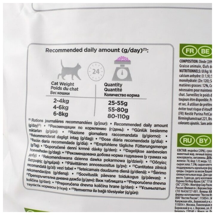 | Дополнительная информация | рекомендации по кормлению, позволяющие поддерживать идеальную форму могут варьироваться в зависимости от возраста животного, его активности и условий окружающей среды; следите за весом Вашей кошки и корректируйте количество даваемого корма; следите, чтобы у Вашей кошки всегда была чистая, свежая питьевая вода; для здоровья Вашей кошки регулярно консультируйтесь с ветеринарным врачом |