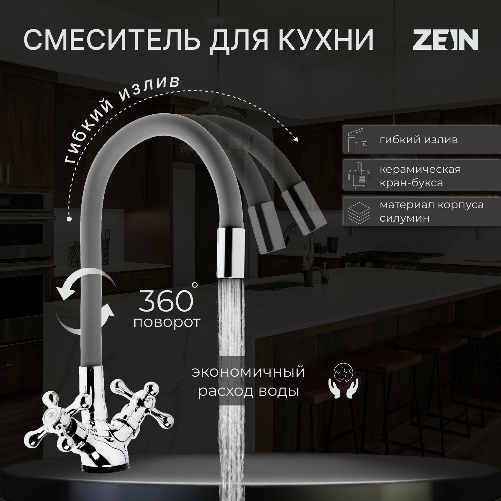 Купить Смеситель для кухни ZEIN Z2108, двухвентильный, силиконовый излив, силумин, серый/хром