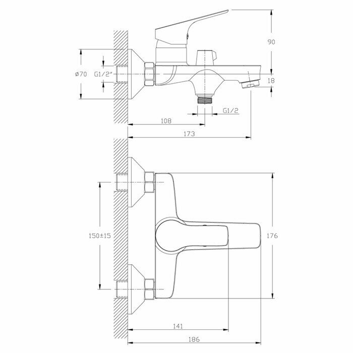 Смеситель однозахватный (35 мм) для ванны, монолитный, душ. лейка RS29-31 Rossinka